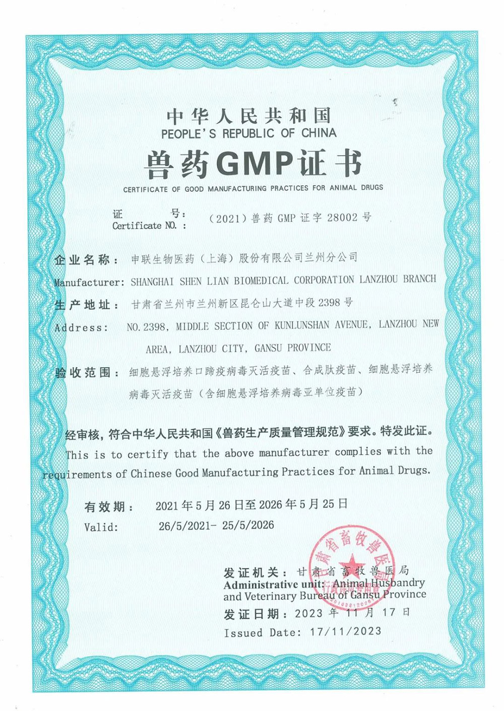 Shanghai Shen Lian Biomedical Corporation Lanzhou Branch is pleased to announce that it has successfully passed the veterinary drug GMP audit and has been granted both the Veterinary Drug GMP Certificate and the Veterinary Drug Production License by the Gansu Provincial Animal Husbandry and Veterinary Bureau.